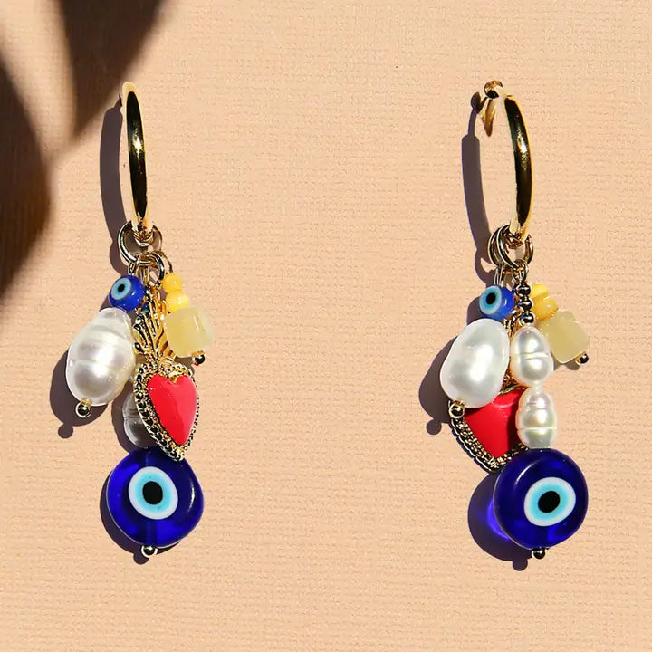 Handmade earrings on gold coated surgical steel hoops with Fresh Water Pearls. These are a great statement earring and are very light on the ears Each piece is hand-made and one-of-a-kind, so they may vary slightly in patterns, colour and paintwork.